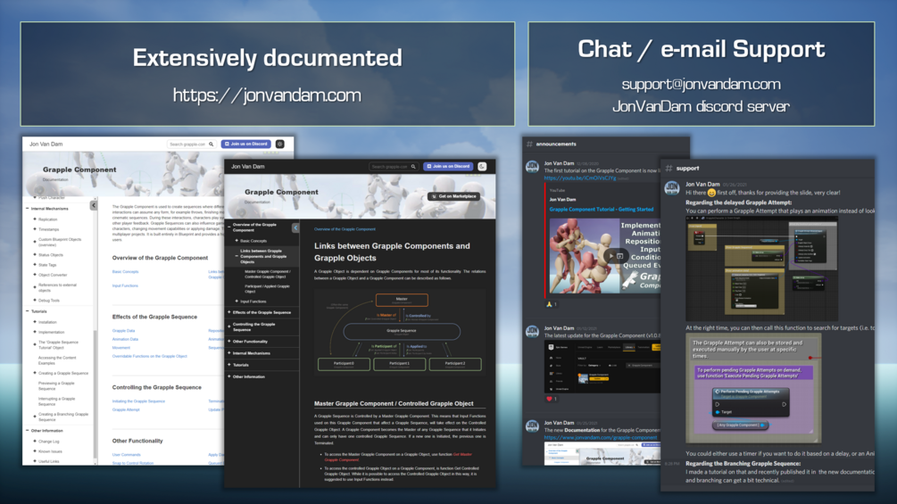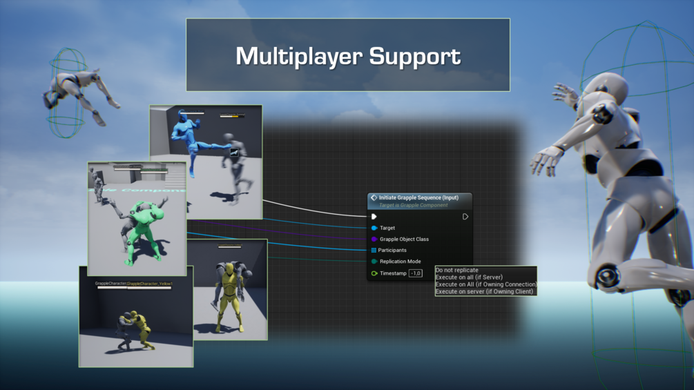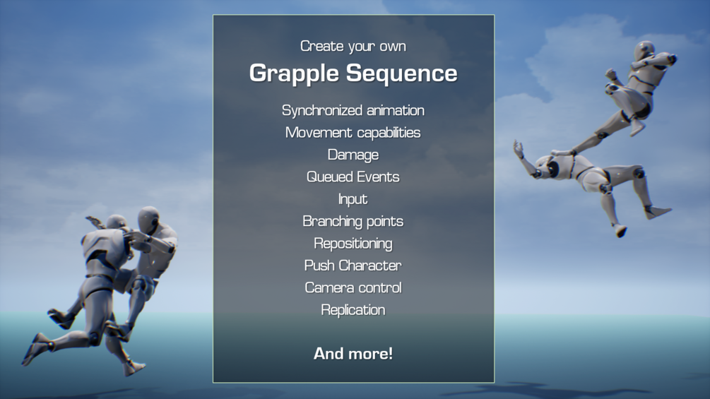 The Grapple Component is used to create sequences where different characters are interacting. These interactions can assume any form, for example throws, finishing moves, revive animations or other cinematic sequences. During these interactions, characters play synchronized animations and provide other player feedback. Grapple Sequences can also influence gameplay, for example by repositioning characters, changing movement capabilities or applying damage.